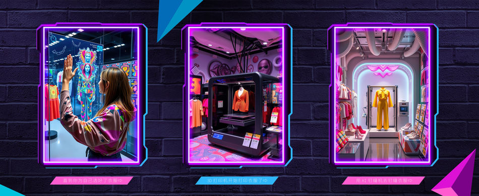 3D Clothing Customization "is a personalized clothing brand with future technology as its core. Through 3D scanning technology, it accurately captures the user's body shape and combines intelligent design systems with cyberpunk aesthetics (neon blue/pink series) to quickly print clothing and accessories that fully fit the body shape. Synchronized online and offline sales, 72 hour delivery, AI robot full service, commitment to "zero error fitting", specially designed for young people who pursue uniqueness, technology and avant-garde style to create a "tailored, what you see is what you get" future fashion experience.